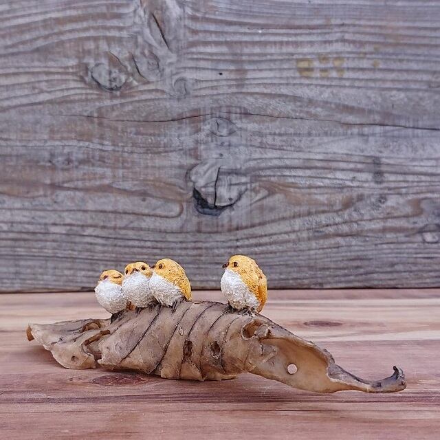 葉っぱの上で楽しげにお喋り中の4羽の小鳥たち