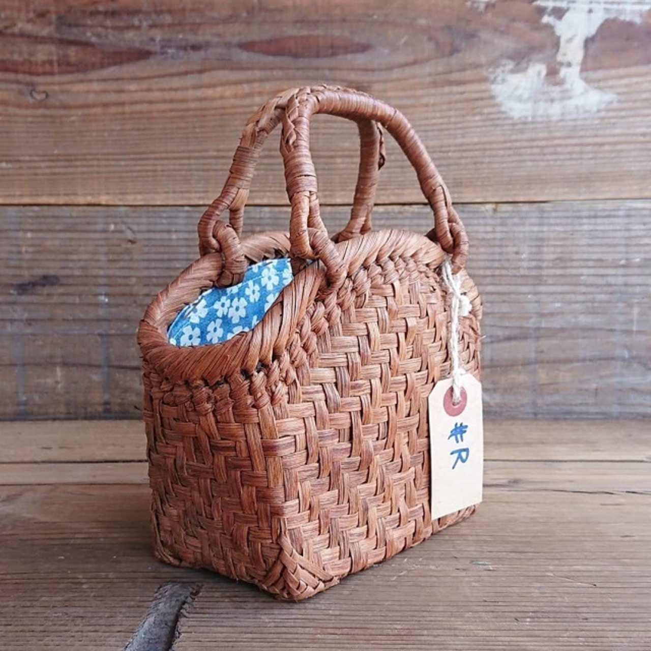 山葡萄の樹皮を編みあげた籠バッグ(内布付き、青色小花柄)